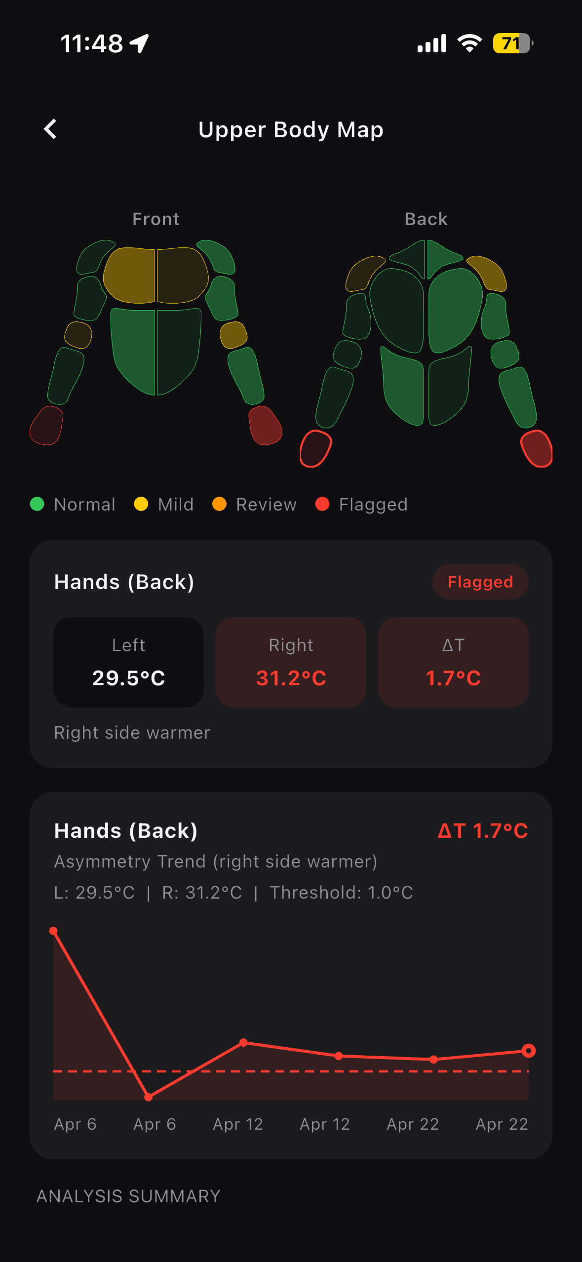 Scan the athlete before training. ATS highlights temperature differences between left and right sides, so your medical team knows who needs attention.