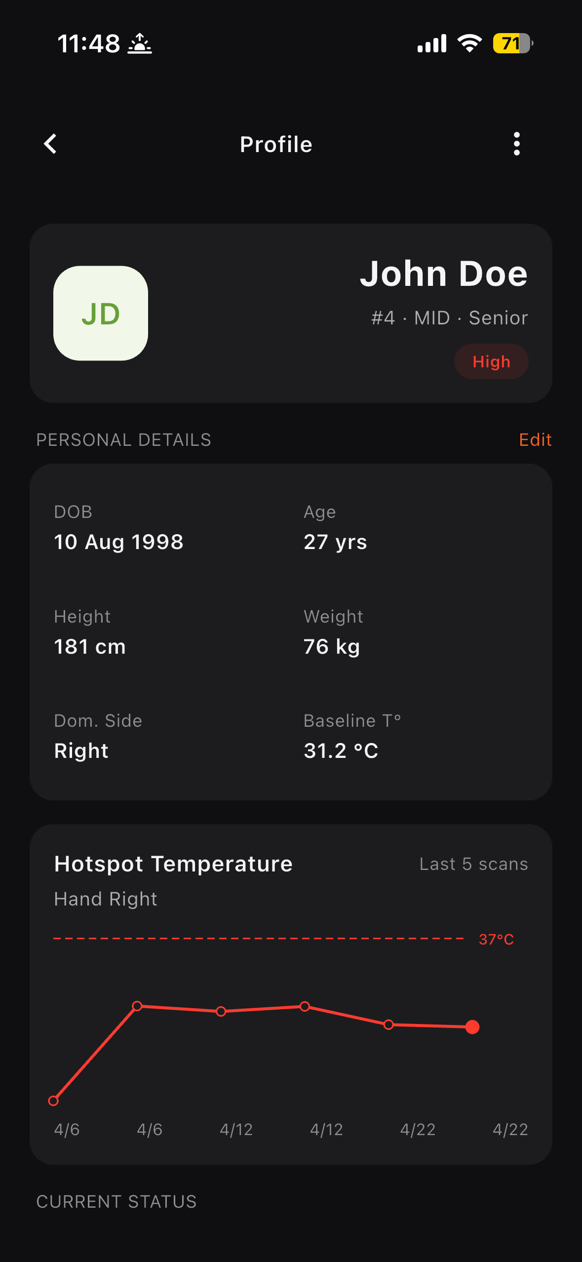 Status tier, trend, last scan. Sort by position, squad, or flag level. Everything your head physio and strength & conditioning coach need, in one place.